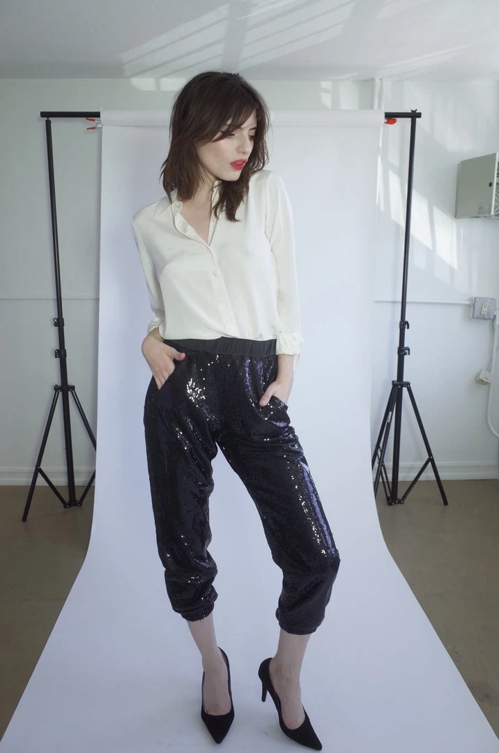 - Black Sequins Elastic Waistband Pants Pockets