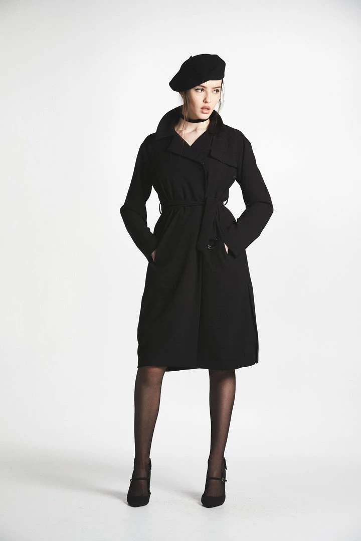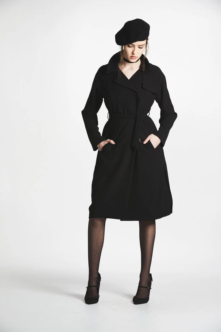 - Black crèpe trench coat with belt