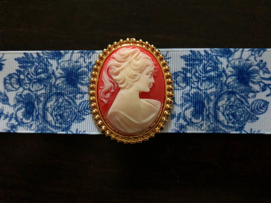 12” long grosgrain choker that is 1.5” wide. With cameo and 2” chain extension. All handmade